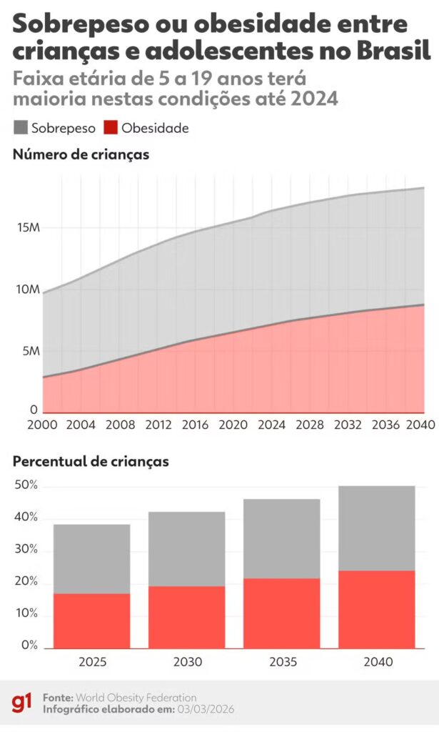 Atualmente, estima-se que 16,5 milhões de crianças e adolescentes de 5 a 19 anos no Brasil estejam com sobrepeso ou obesidade, representando menos de 40% dessa faixa etária. Para 2040, a Federação Mundial de Obesidade projeta que mais da metade das crianças e adolescentes brasileiros estará acima do peso ideal.